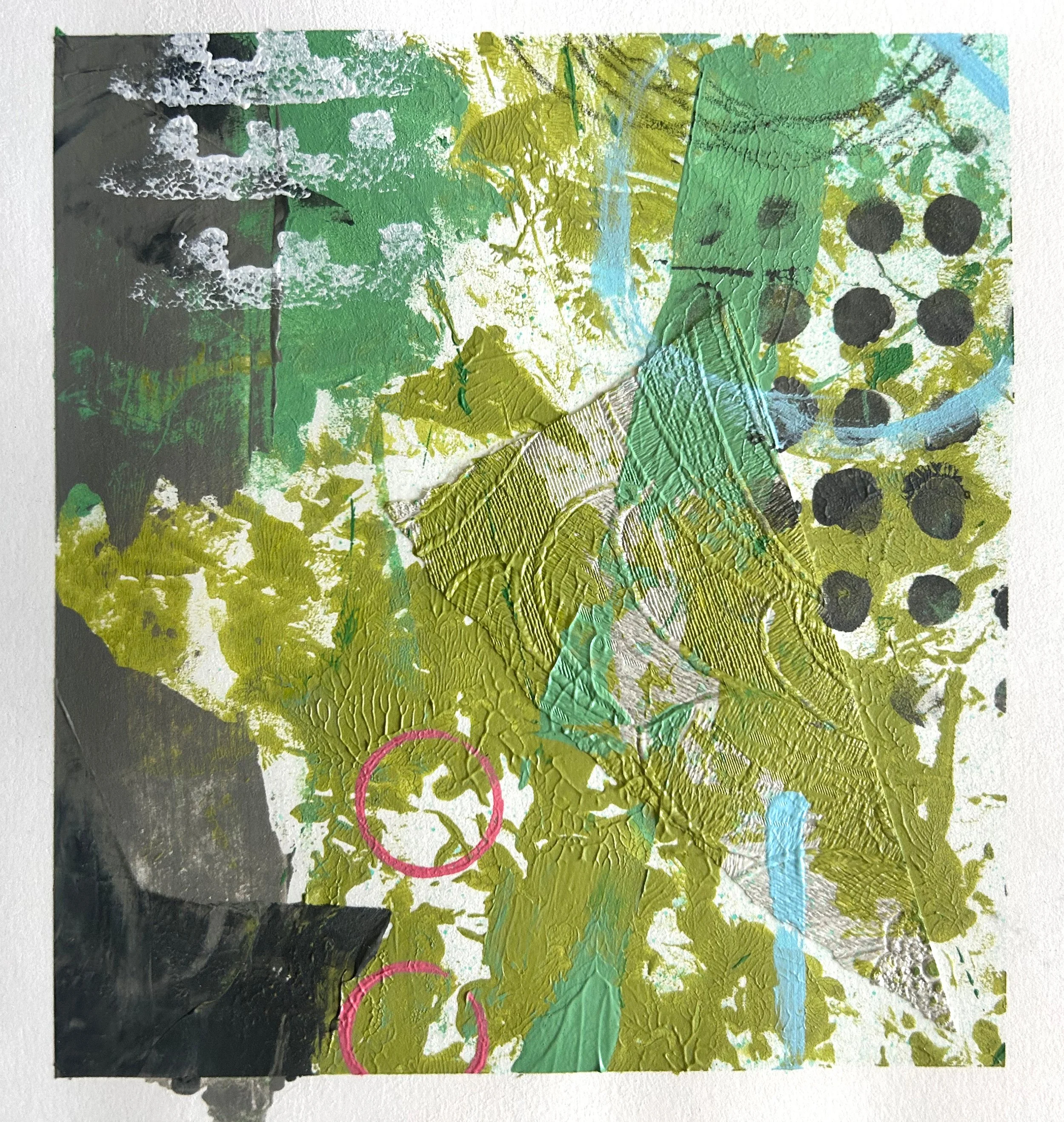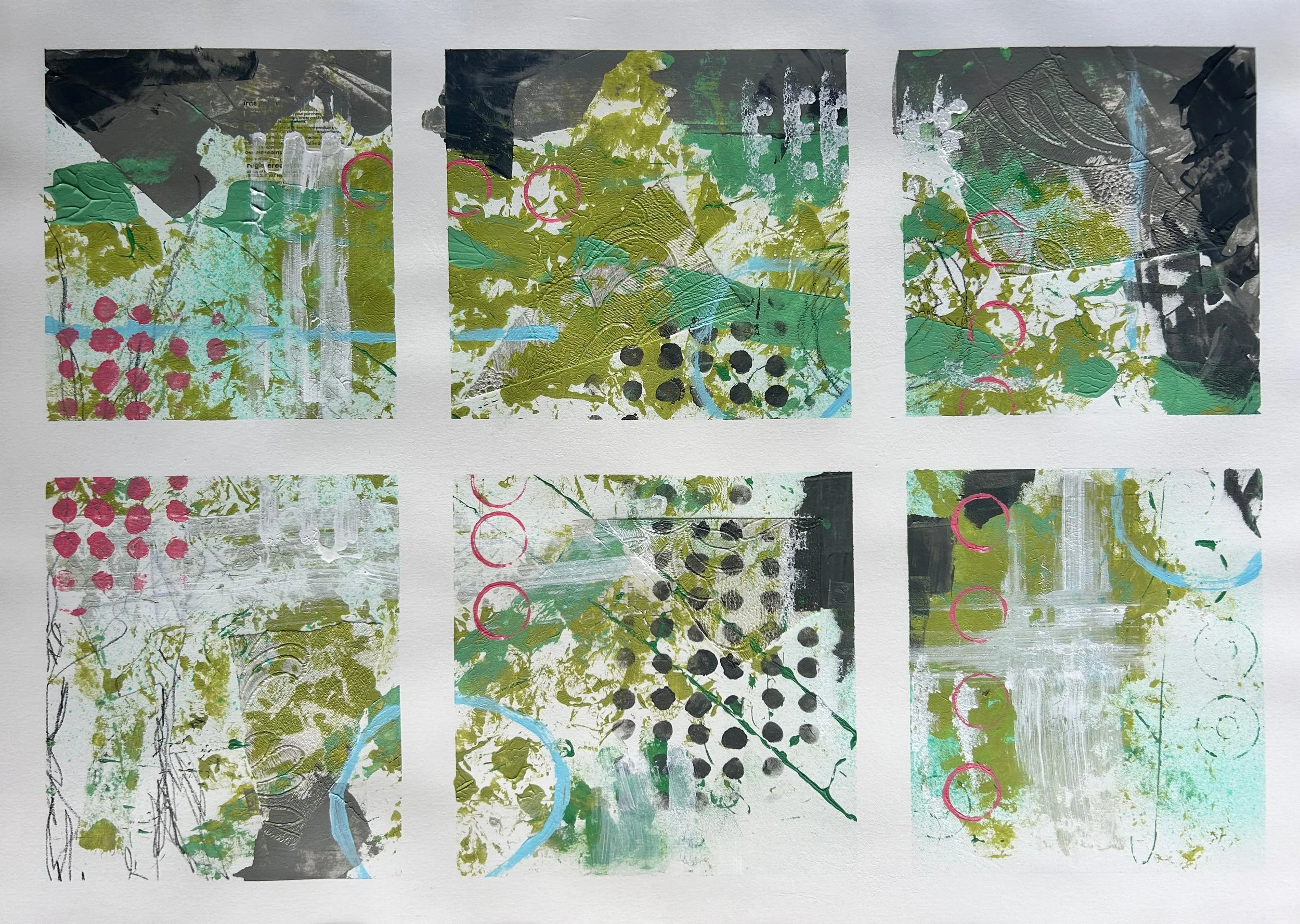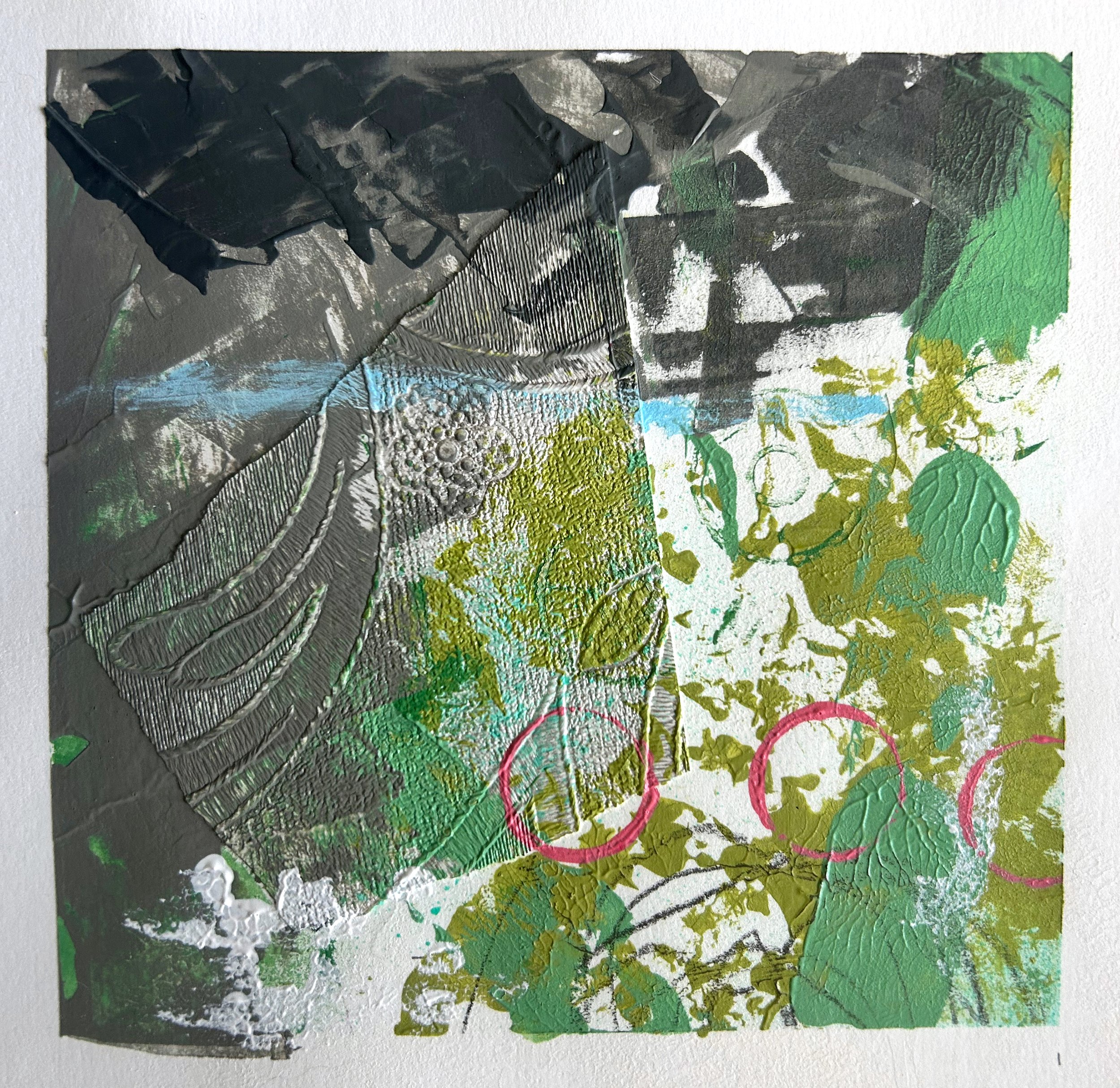 Another grid piece with collage and mark making in acrylic paint, pencil and more. The hit of pink works well with the otherwise cool palette.