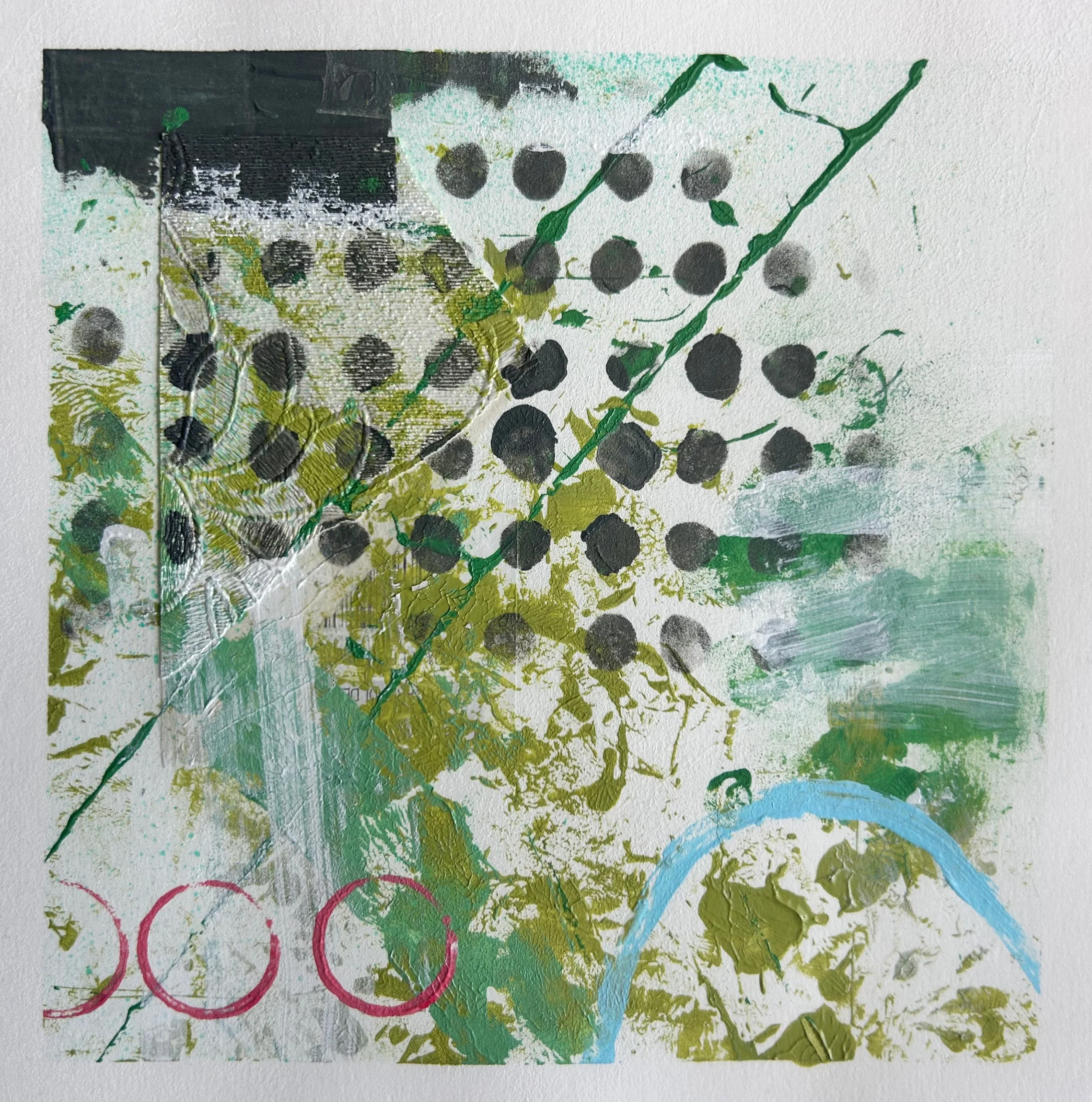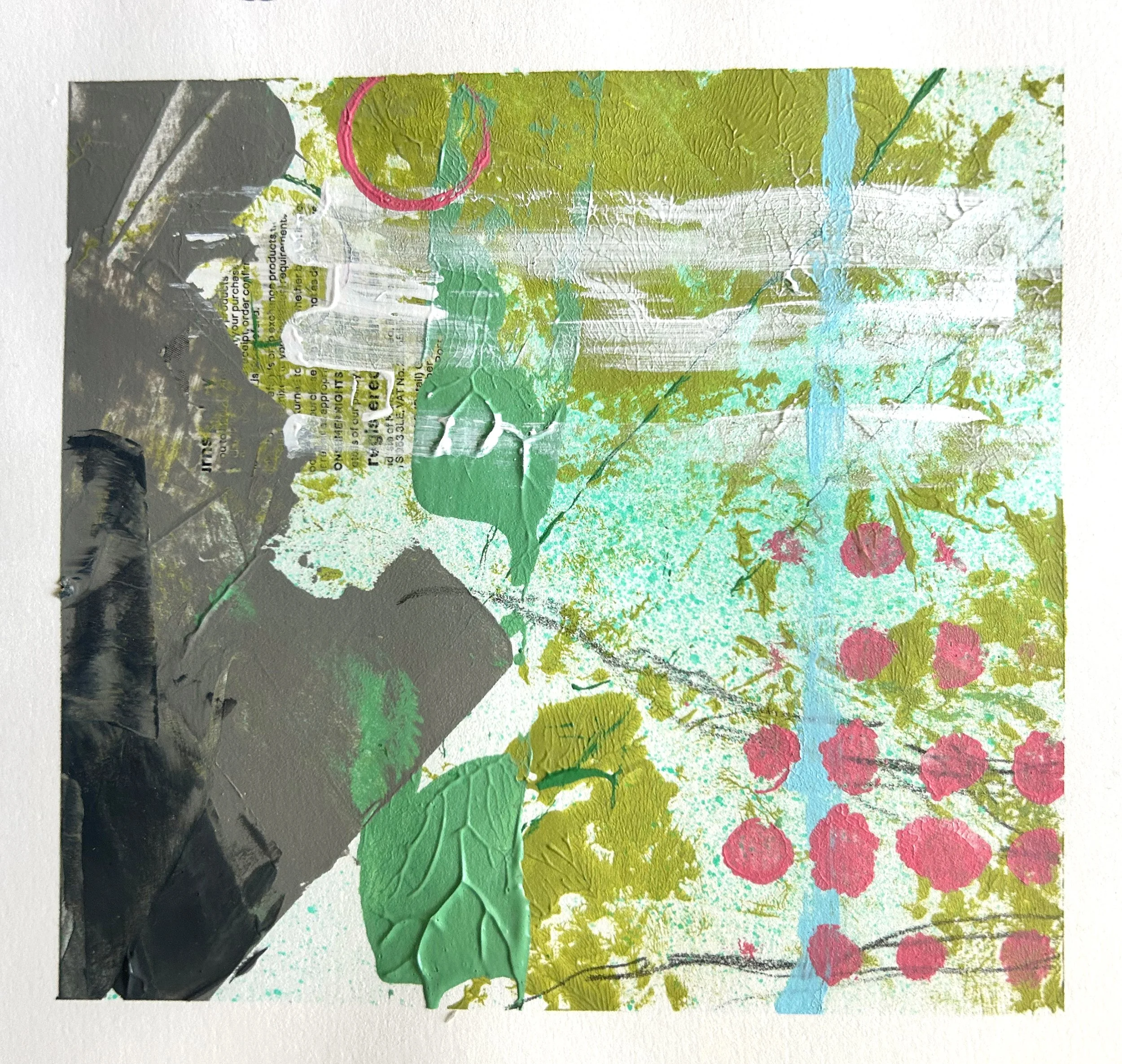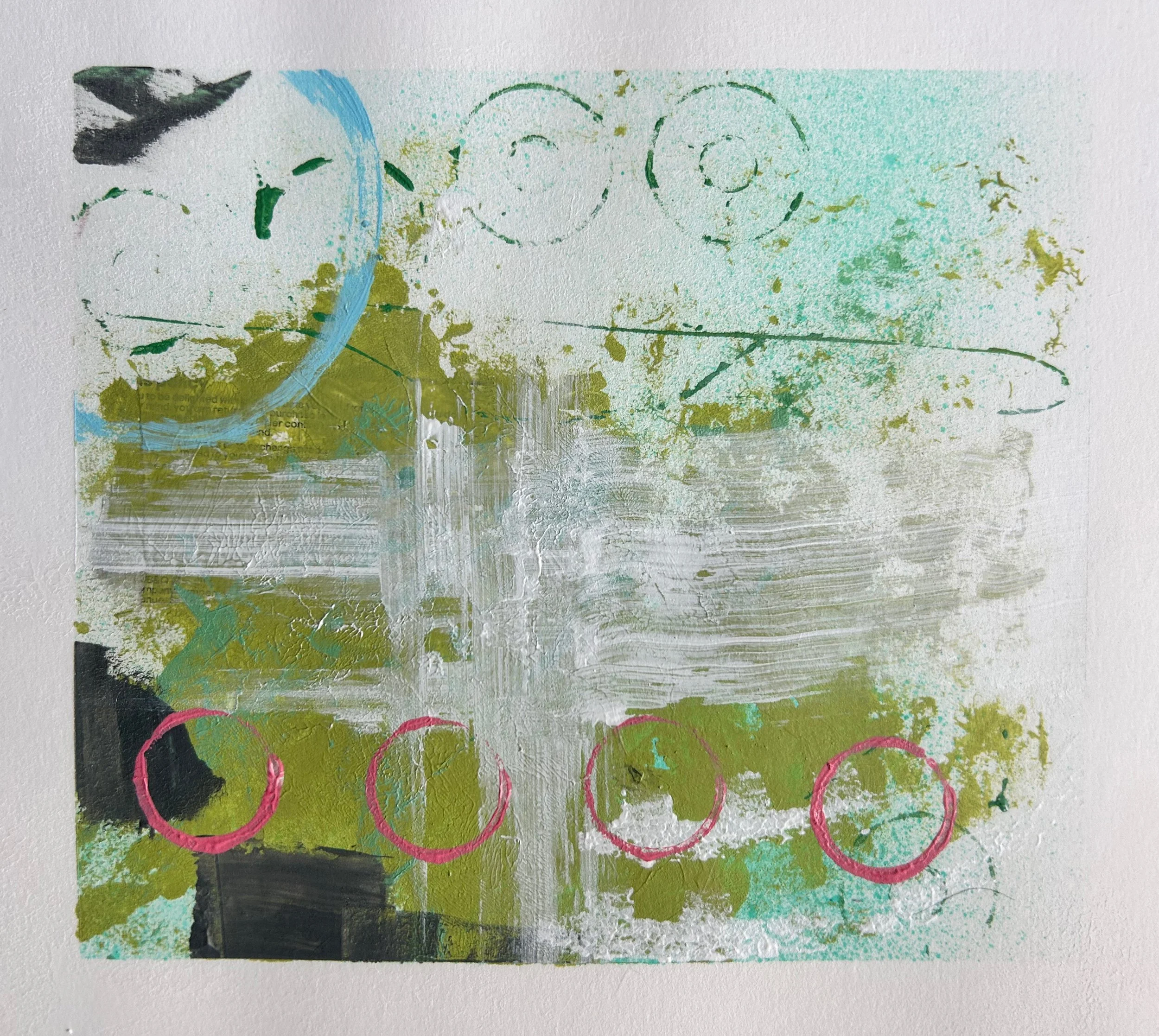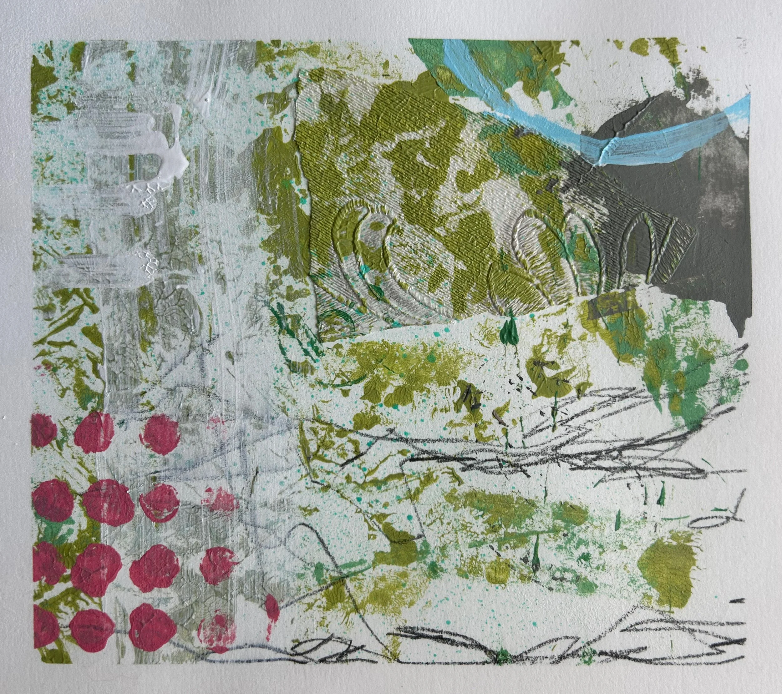 Another grid piece with collage and mark making in acrylic paint, pencil and more. The hit of pink works well with the otherwise cool palette.
