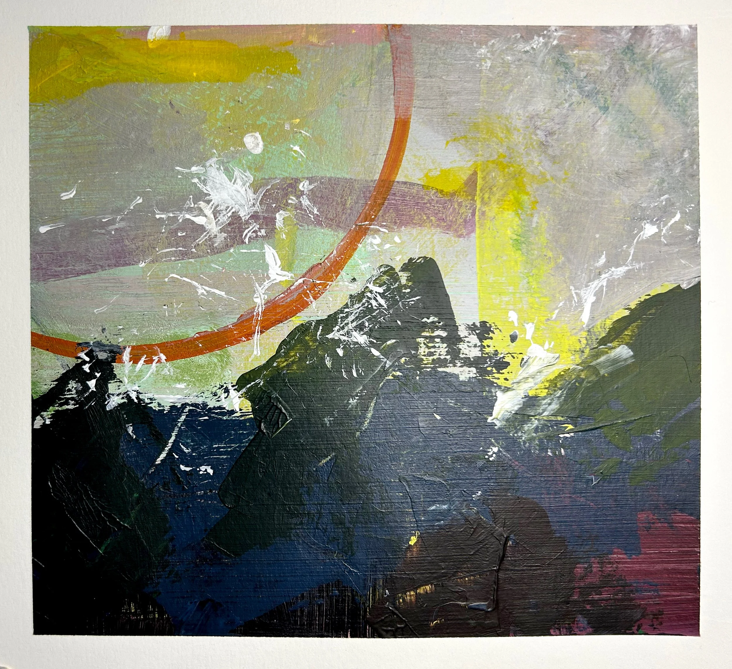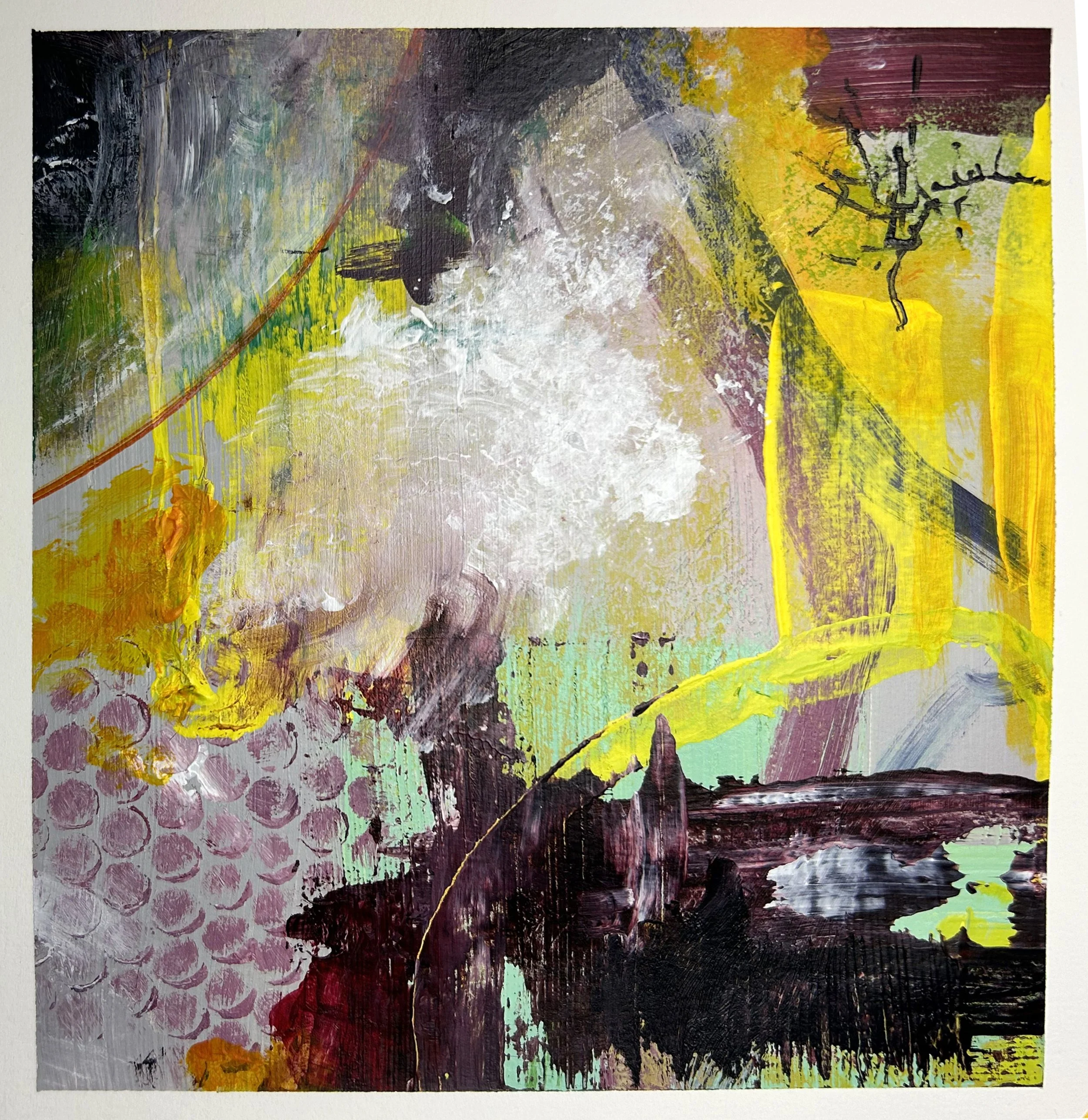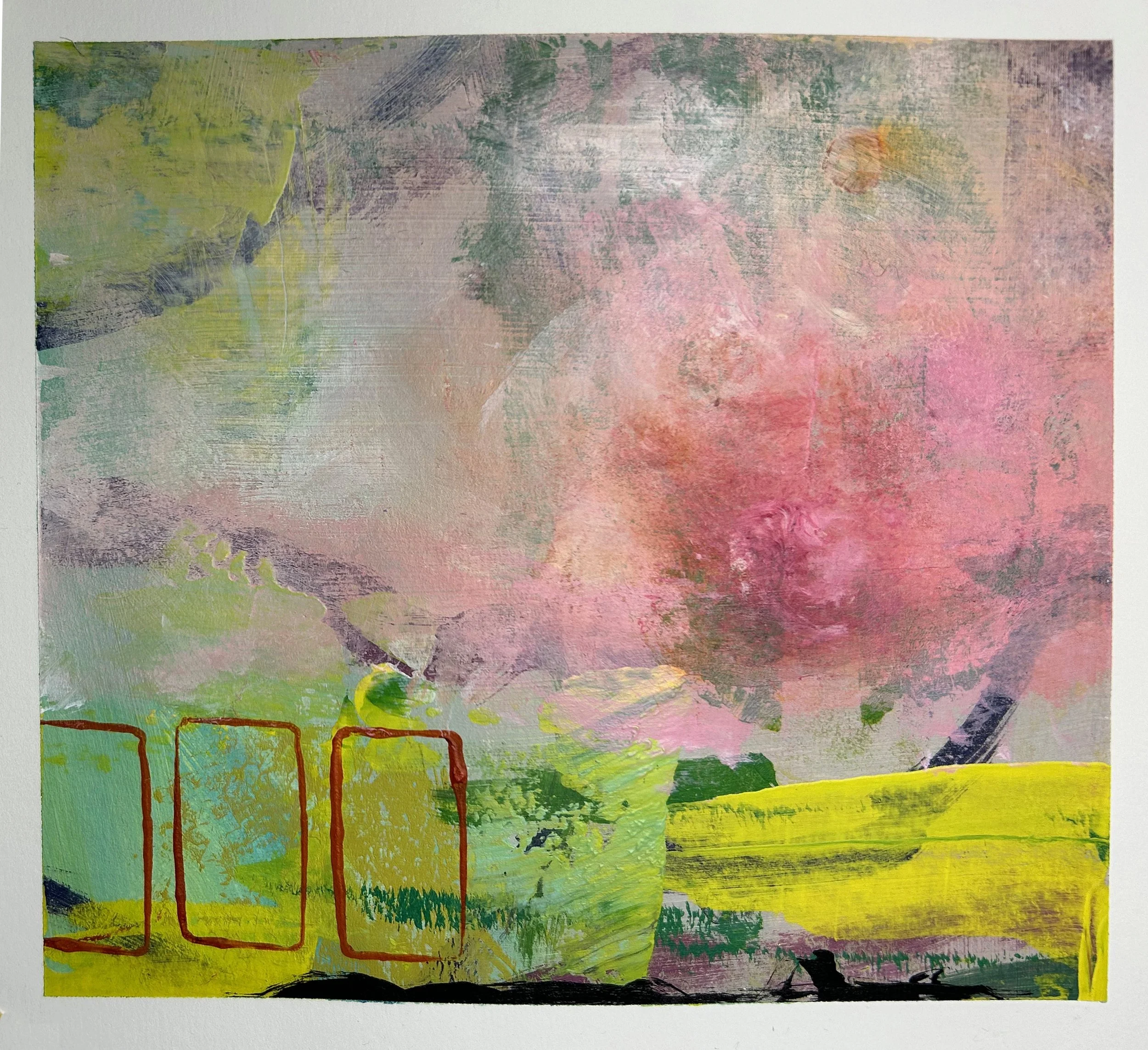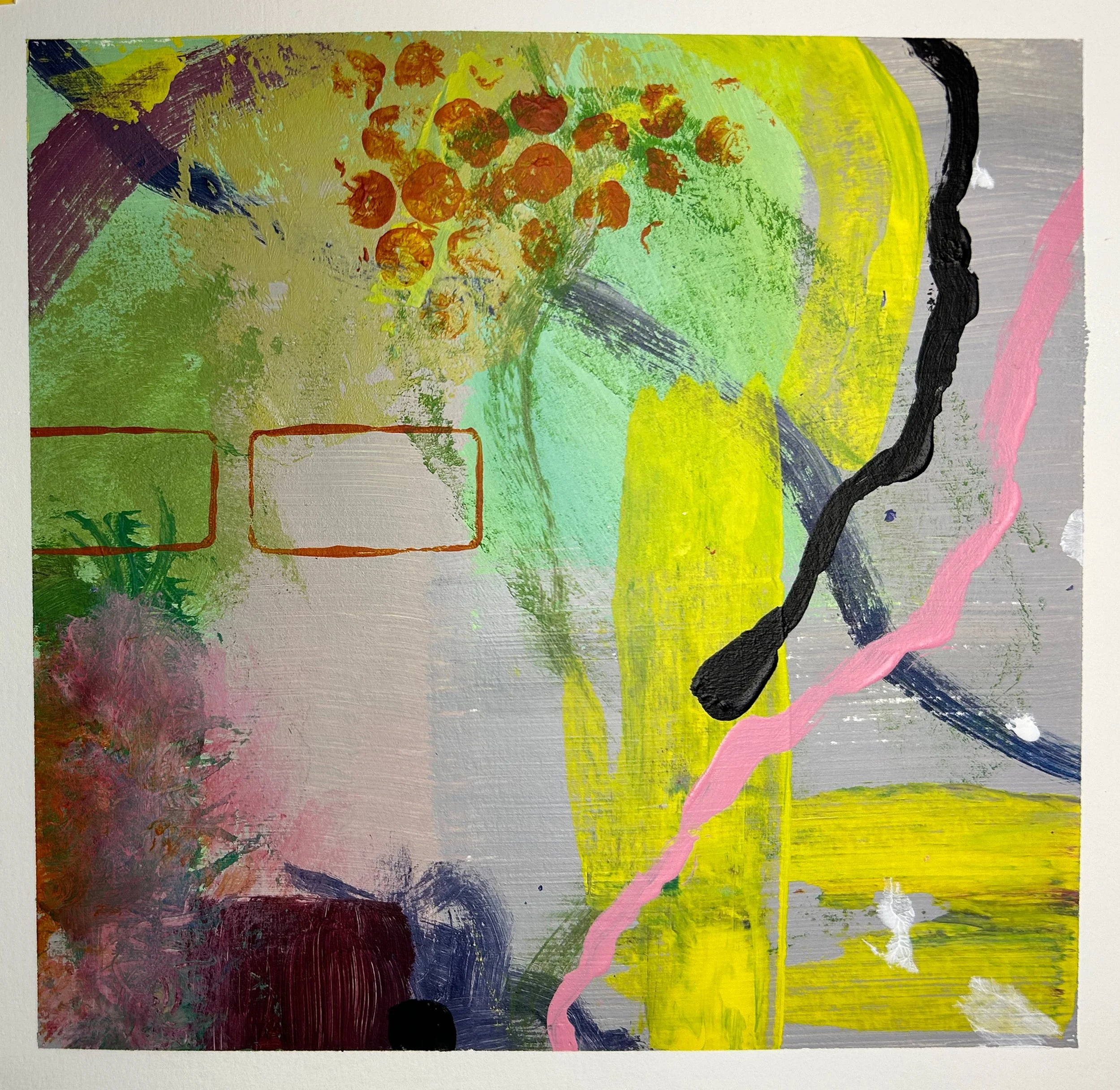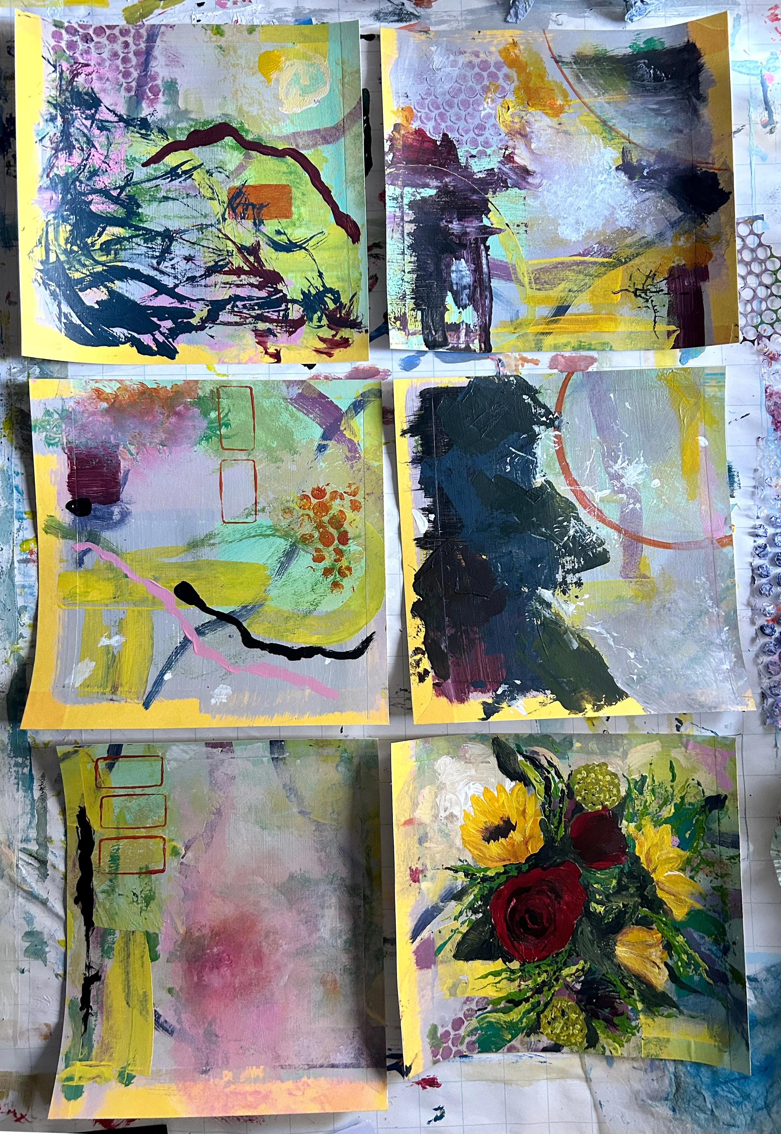 Sketchbook collage work – marking making and playing. From a large sheet sectioned off into six with masking tape came some very different images. I really liked how the colours worked out on these – just using the same three red/yellow/blue colours plus black and white. I used the flowers for a birthday card.