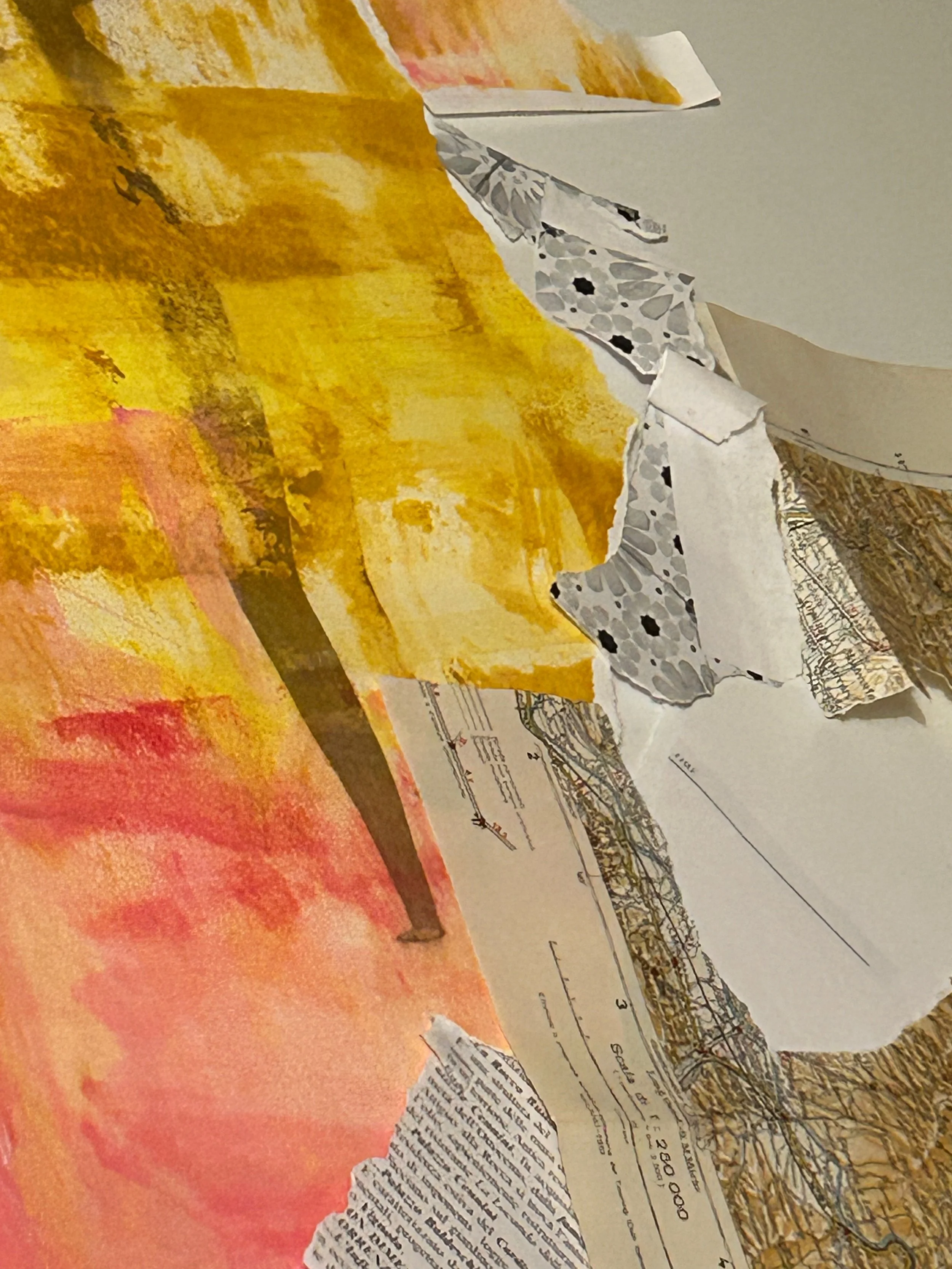 The buildings are made up of the yellow/pink ‘play’ painting I made; the tile patterns used in the paving; the map (of the same region!) makes the arch and text was used in the sky. I did go over much of it so it became very subtle but the thickness of the papers also brings texture.